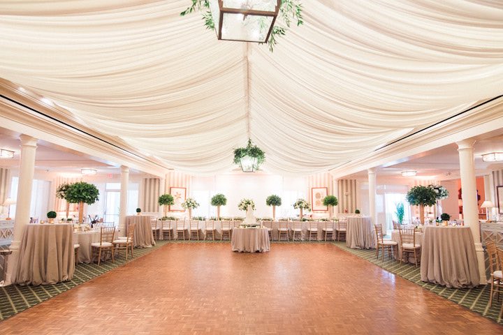 Gold and White Reception Decor With Pops of Emerald Green